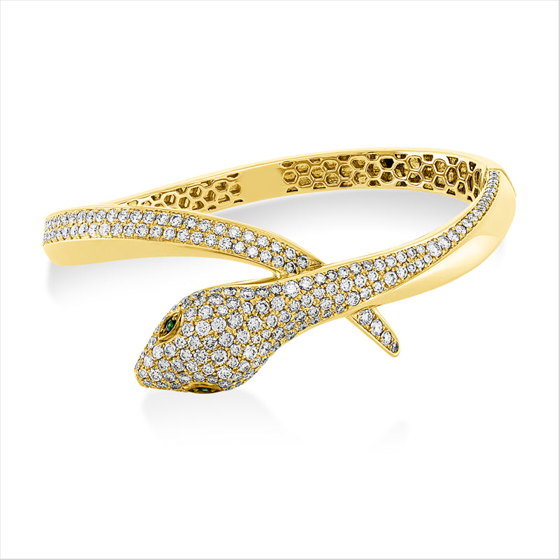 Armreif 18 kt GG Schlange. Fassung schwarz rhodiniert. 223 Brillanten 4.27 ct. TW-vsi. 2 Tsavorith 0.06 ct grün. H:47.0 mm. B:57.0 mm