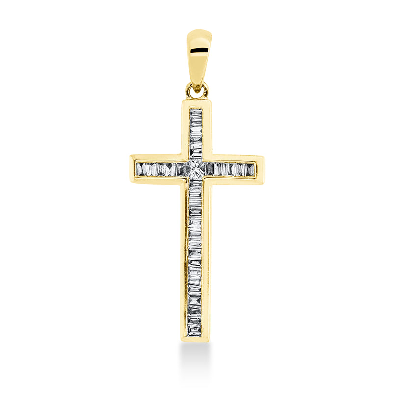 Anhänger 18 kt GG Kreuz. mit Öse. 1 Princ. 0.04 ct. TW-si. 31 Baguette 0.23 ct. TW-si. H:27.4 mm. B:12.0 mm. S:1.8 mm