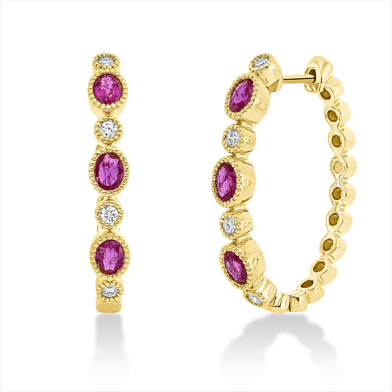 Creolen 18 kt GG. 8 Brillanten 0.24 ct. F-vsi/si. 6 Rubine 1.07 ct rot. H:27.3 mm. B:19.7 mm. S:4.4 mm