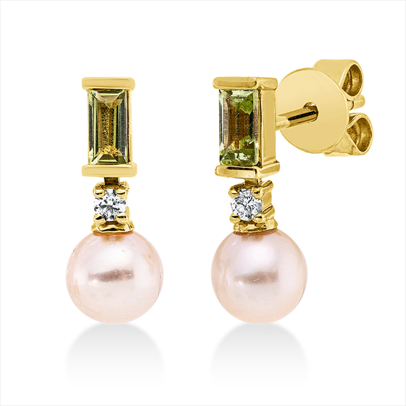 Ohrstecker 18 kt GG, 2 Brill. 0,04 ct, TW-si, 2 Peridot 0,24 ct grün, 2 ZP weiß 5 mm