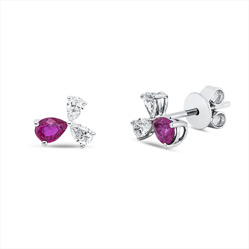 Ohrstecker 18 kt WG, 4 Tropfen 0,21 ct, TW-si, 2 Rubine 0,33 ct rot