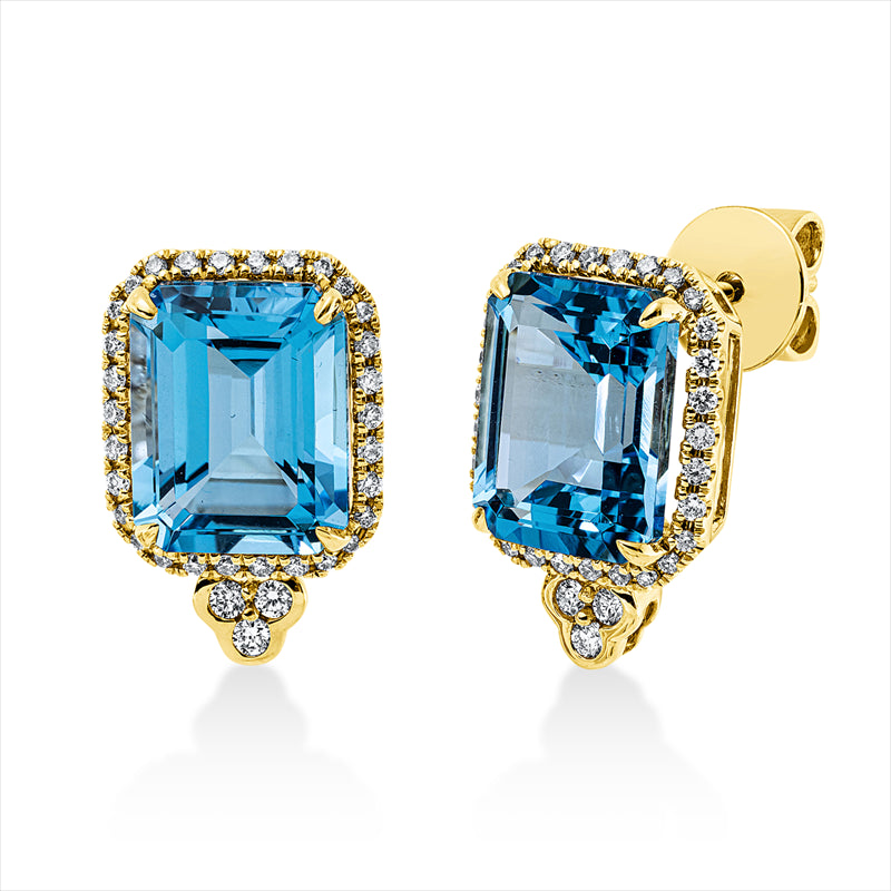 Ohrstecker 18 kt GG, 66 Brill. 0,36 ct, TW-si, 2 Blautopase 8,60 ct blau