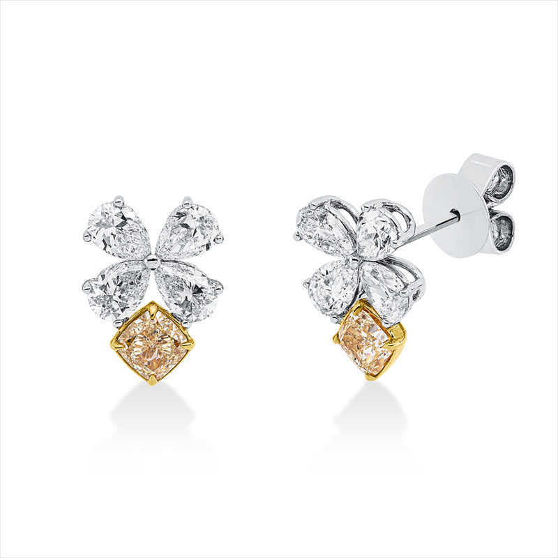 Ohrstecker 18 kt WG+GG, 2 Cushion 0,70 ct, gelb, 8 Tropfen 1,44 ct, TW-vsi