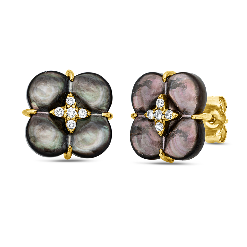 Ohrstecker 18 kt GG. 10 Brillanten 0.10 ct. TW-si. 2 Perlmutt schwarz. H:12.8 mm. B:12.8 mm. S:4.0 mm