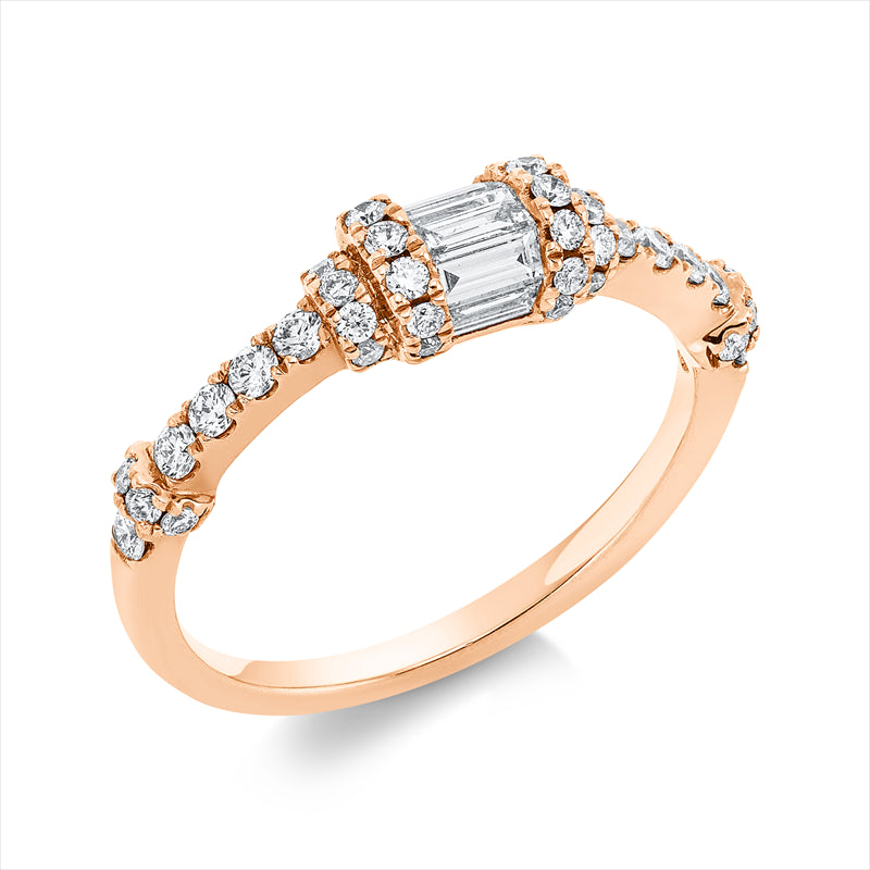 Ring 14 kt RG, 24 Brill. 0,28 ct, F-vsi/si, 5 Bag. 0,23 ct, F-vsi, 18 Brill. 0,12 ct, F-vsi/si
