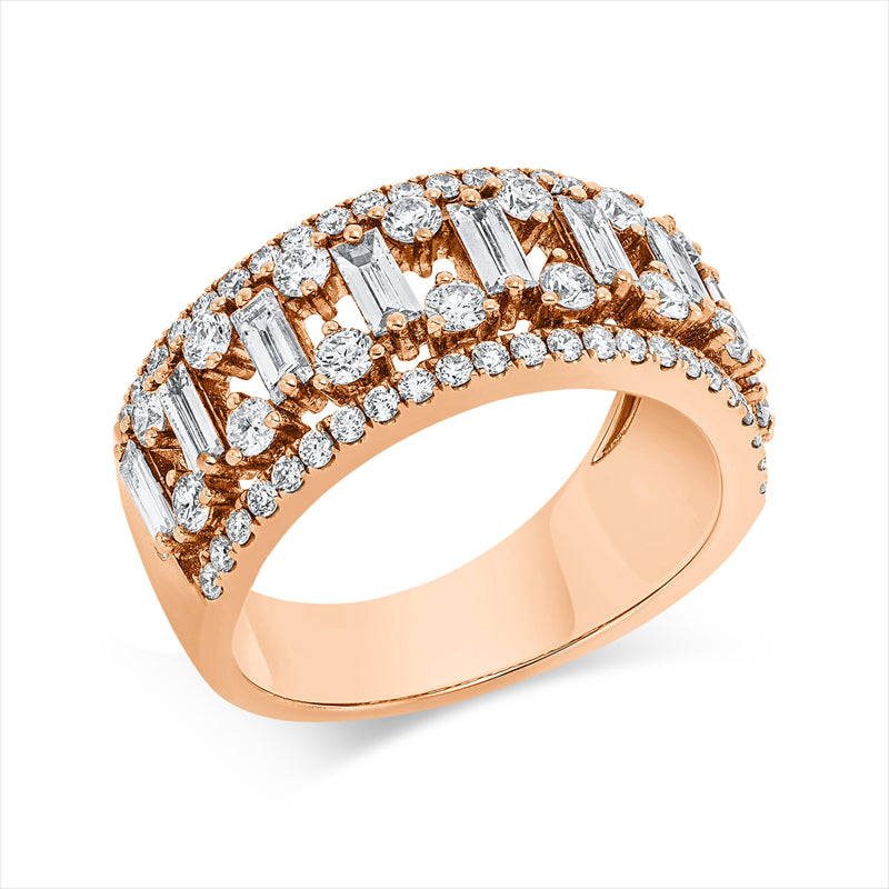 Ring 18 kt RG, 16 Brill. 0,55 ct, TW-si, 9 Bag. 0,60 ct, F-vsi/si, 46 Brill. 0,37 ct, TW-si