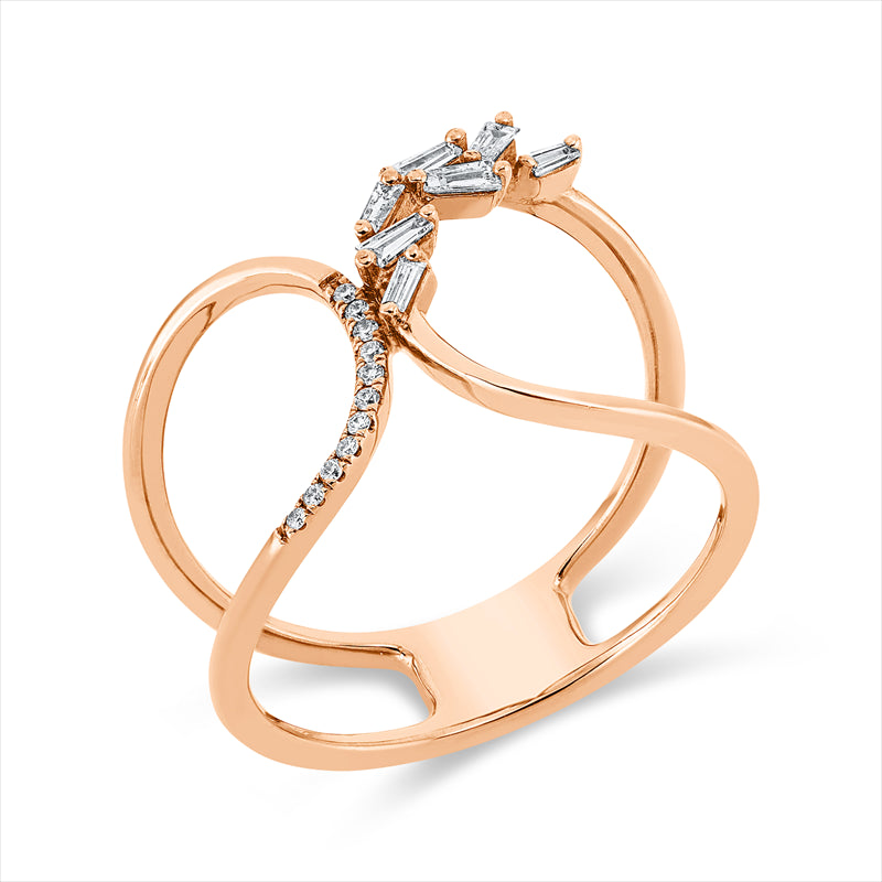 Ring 18 kt RG, 7 Trap. 0,11 ct, TW-si, 11 Brill. 0,03 ct, TW-si